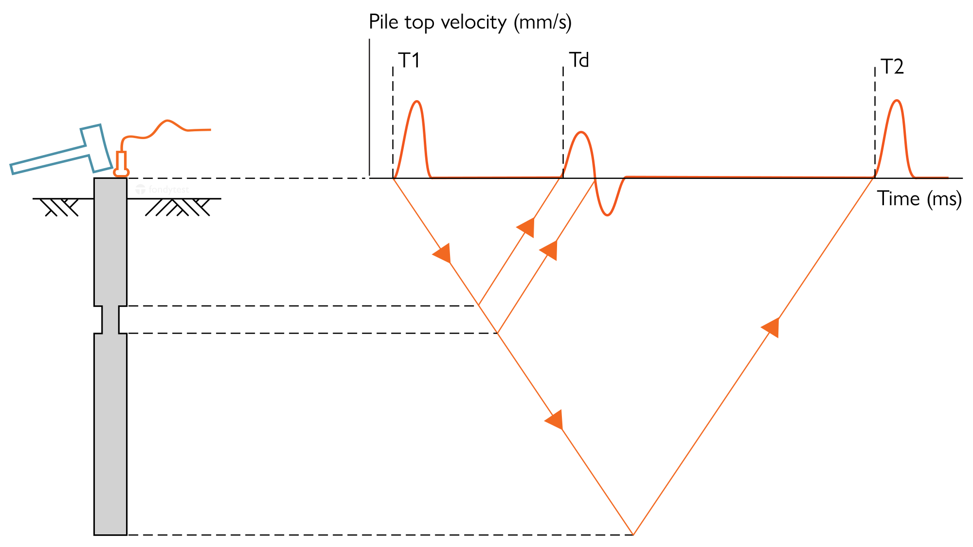 The hammer strike at time T1 sends a wave down the pile, which reflects back when it encounters changes in the pile impedance (cross-section or concrete quality, time Td) or at the bottom (time T2).